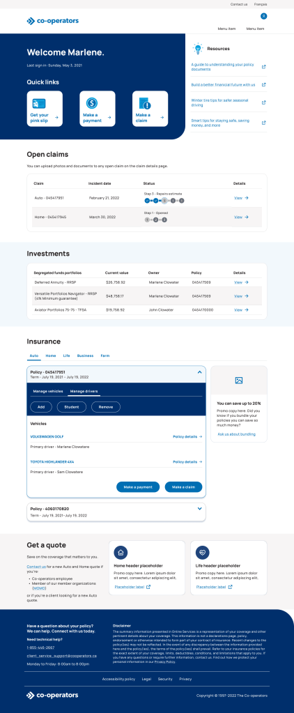 Online Services is where Co-operators customers can sign in and manage their insurance policies and investment accounts digitally, either online or through the app.